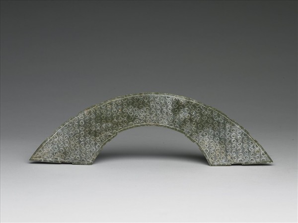 玉質,呈青綠色,因局部受沁而有白化現象。飾以錯落有致的榖紋。尺寸較大,不利於日常佩戴,一般多作為喪葬或是祭祀玉器。