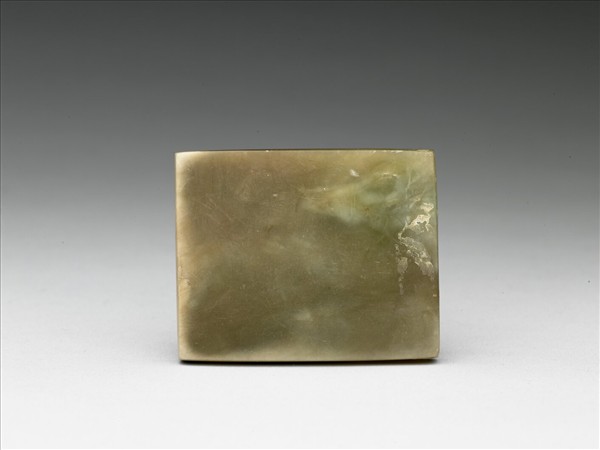 玉質,呈青綠色,局部沁作灰白色。長方形帶版,平素無紋。帶版背面,有三至四組的隧孔,內中有殘餘的金屬與織物。購玉646-660,十五件一組。