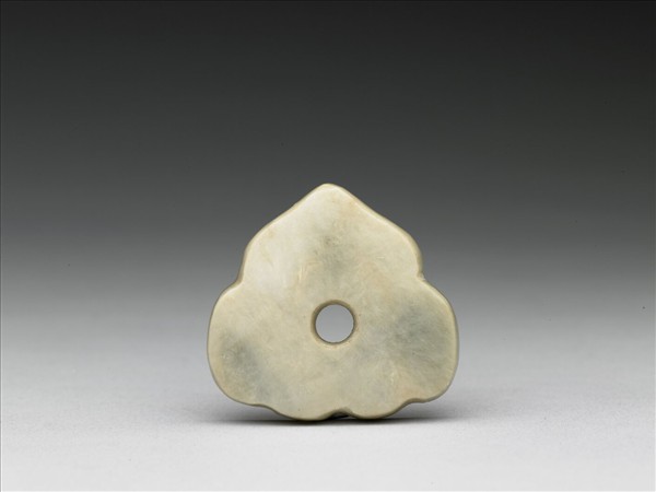 玉質,呈青綠色,局部沁作灰白色,桃形銬,有圓穿,平素無紋。購玉646-660,十五件一組。