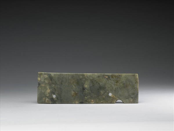 玉質,呈灰青泛藍色,緻密不透明,為典型的華西地區常用的玉料。窄長梯形,刀背處鑽有二孔,還有半個大圓孔。對應的刃邊,有一很小的圓孔。兩處圓孔的功能不詳。平素無紋。