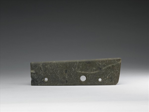 玉質,呈不太勻淨深褐色,有淺的灰黃色蛛網沁斑。造形端雅,刀背處有二小圓穿,應用以綁縛木柄。另有一大圓孔,或用以嵌彩石。刀的前端略斜出,後端較直。有一小片圓凹。平素無紋。