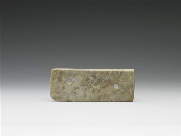 玉質,呈灰青褐色,有似蛛網般的灰色沁斑,緻密堅實,為典型的華西玉料。這件玉刀雖小,但二圓穿的佈局,十分標準,一個接近柄端,與之相對應的短邊,也磨薄成刃。另一圓穿接近刀背,與之對應的是長的邊刃。二穿都是由單面鑽鑿,柄孔的旁邊,還有淺淺的,鑽鑿不正的痕跡。平素無紋。