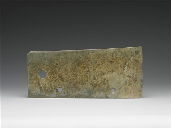 玉質,呈灰青褐色,有似蛛網般的灰色沁斑。緻密堅實,為典型的華西玉料,表面還有大片的似紡織物的褐色點斑。這件玉刀雖經斷接修補,但造形端正。刀背(約0.4公分)與刀刃(0.2公分)厚度相差不大,刃鈍,無使用痕。有刀鋒與刀柄之別,柄端有一大的柄孔,所對應的窄邊上,有一修補。