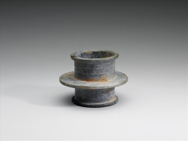 玉質,表面大部分沁有蛛網般的灰白色斑,沾有少量硃砂。全器作一高圓筒狀,上下口緣向外折。中段凸出圓片狀裝飾,近邊緣處,有一小孔。上下兩節。各有三條等分器壁的淺浮雕弦紋。最靠近圓壁形凸起的弦紋與圓壁之間的器表,還雕有細密的多條淺弦紋。功能不詳。