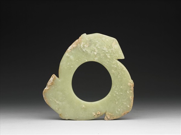 牙璧可能萌芽於遼東半島的小珠山中層文化,早期牙璧較小,剖面多呈棗核形。山東半島在大汶口文化晚期遺址出土的牙璧雖也偏小,但剖面多較平。到了山東龍山文化,牙璧不但變大,「肉」甚寬,且多孔緣處較厚,外緣漸薄。 此件牙璧甚大,以淺黃綠閃玉雕琢,整個輪廓略近橢圓三角形,外輪廓分散褐色斑,說明這件可能是將河中近於橢圓三角形的籽料剖切玉片製作,保留了籽料的玉皮。中孔是不甚圓的大圓孔,孔壁較厚,邊緣較薄。牙璧的「肉」甚寬,順著外輪廓切割出三個三角凹缺,形成三個同向、肥短的「牙」。再於三段弧形輪廓的中間部位雕琢凹凸紋飾。仔細觀察,其中二個是簡化的「『介』字形冠」,另一個可能是簡化的「蟬紋」。最相似的牙璧,採集自山東臨朐朱封山東龍山文化遺址,後者外緣雕琢三個簡化的「『介』字形冠」。