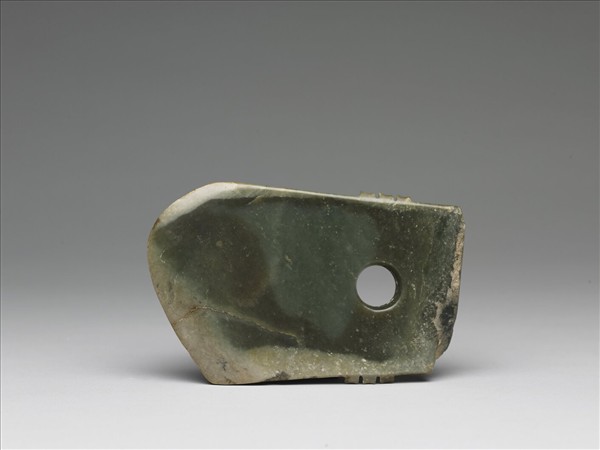 由器上的色澤變化觀察,這件玉器是用一柱狀玉料,剖切一厚片所磨製的。所以,自器的中央向邊緣處,顏色一層一層不同。最內為深灰藍,圍一圈草綠色,最外為淺灰褐色。經此分析觀察可知,此玉戚的刃部呈不規則狀,應是先民不願切去玉料之故。柄端有一大圓穿,兩側邊各有一組三出的齒稜。此戚與數件山東龍山文化風格的玉器,出土於山東境內。