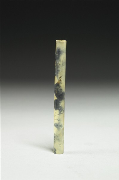 一種牙黃夾雜不規則灰黑團塊的玉石。呈長管狀,素面無紋。