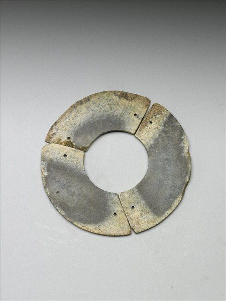 玉質,呈深淺不勻灰色,散佈藍灰色斑點。由顏色分布觀之,似為由一塊較厚的扇形玉片,橫剖為三片,再經修整而成。併接後,雖厚薄不勻,但大致尚稱圓整。每一片扇形玉的兩端,各鑿一單而鑽成的小孔。有明顯的直條切割痕。