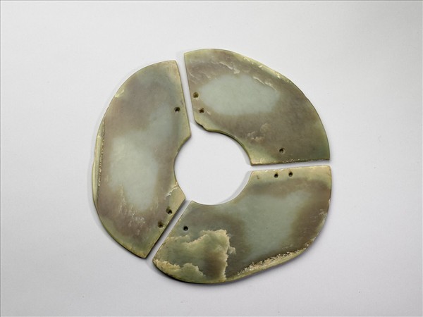 玉質,呈青灰色夾雜褐色,局部泛綠色,雖有大片綹斑,但尚稱溫潤。由顏色分布觀之,似為由一塊較厚的扇形玉片,橫剖為三片,再經修整而成。拼接後,稍有厚薄不勻,亦非正圓。每一片上都有直條切割痕,與多處傷缺。每片的兩端,分別鑽鑿一個與兩個單面鑽成的小孔,應用以綁縛繩索。