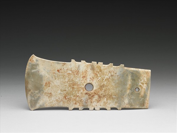 玉質,呈牙黃泛灰色。一面的器表似乎曾用硃砂繪有某種圖案,局部還有編織物的沁痕。戚身修長,兩側邊琢對稱的戚齒,有二圓穿,上一圓穿應是用以綁縛木柄,下一圓穿較大,應是鑲嵌松綠石,但已脫落。