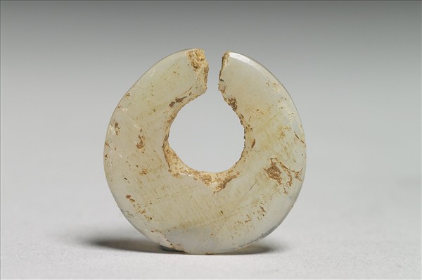 略帶透明的白色玉髓,周沿有蝕變現象。琢作扁橢圓形,一側較寬,另一側較細,有一窄缺口。由形制特徵可知,乃為戰國至西漢之時,位於今日貴州地區夜郎國的貴族玉飾。