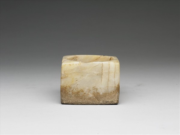 玉質,多處有裂紋,一端有兩處傷缺,另一端黏附淺褐色物質。琢作方筒形,整體觀之,甚歪斜。中央有大圓洞,孔璧微向內凸出,孔之一端,有半圈台階式的凹下。古拙樸實。應屬甘肅地區馬家窯或齊家文化的原始型玉琮。