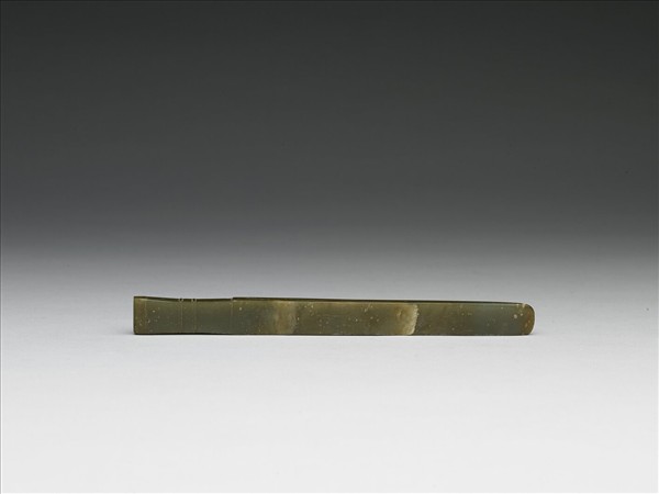 玉質,有綹,局部帶褐色。琢作一柄形器,扁長形頂部,頂下部份微縮,琢凸弦紋二周。下方形成肩部,直切而下,最下端削薄成不規則的插榫。較接近商後期的風格。