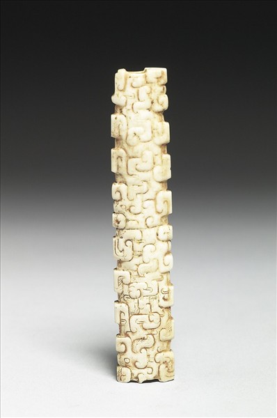 玉質,器表少量硃砂與泥土的痕跡。與購玉752雕作一對扁管,中部微鼓。器表雕連續鋪排的側面龍首紋,龍的角與捲鼻,形成方塊形凸起。