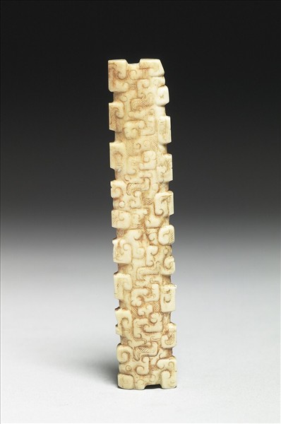 玉質,器表少量硃砂與泥土的痕跡。與購玉751雕作一對扁管,中部微鼓。器表雕連續鋪排的側面龍首紋,龍的角與捲鼻,形成方塊形凸起。
