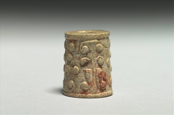 玉質,局部受沁白化,有硃砂等附著物,飾以雲穀相雜紋。