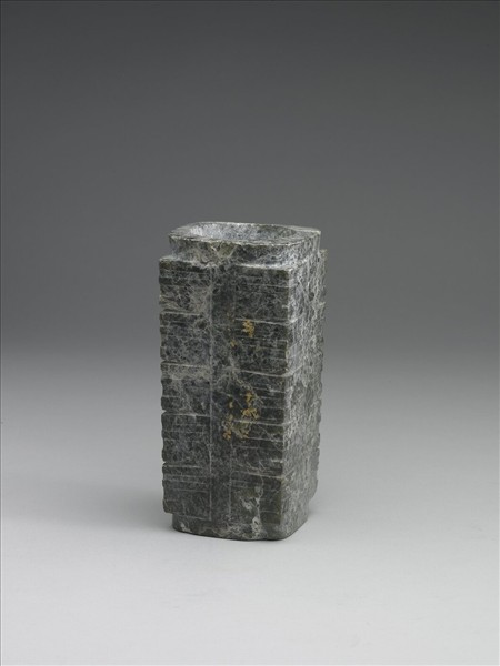 發展約千年的良渚文化可分早晚二期,其間最大的改變就是原本套在手腕或手臂上的玉方鐲,突然蛻變成高方、厚重、孔小、紋簡,無法套戴於腕的玉器。雖然從墓葬裡的擺放上,看不出這種方柱形玉器與圓而有中孔的玉璧,有任何組配關係,但從出土、流散、傳世品可統計,一些與天象有關的符號(如「鳥立祭壇」等),只刻在圓璧與這種方柱形玉器上。強烈顯示後者就是「玉琮」,二者應是成組祭祀天地的禮器。 良渚文化早期盛行「動物精靈崇拜」信仰,突然在良渚晚期出現「天體崇拜」的信仰。此一改變很可能是黃河上中游的本土宗教信仰,經由「上層交流網」向長江下游傳播的影響。 這件是典型良渚文化晚期玉琮,琢作略帶上大下小的方柱體,內有上下直穿的大圓孔。外壁雕五節小眼面紋。