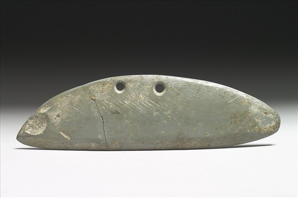 石質。器作不規則的橢長形刃線略直,微帶使用痕。刀背成弧形,有二小圓穿,由二面對鑽而成。器表有數處凹缺,曾斷接。