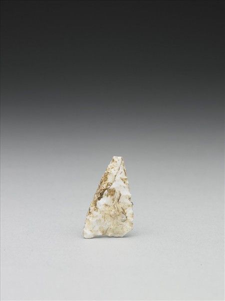 屬石英類礦物,不透明白色,以壓剝法,製成不規則的三角形,為新石器時代華北居民製作的石鏃。