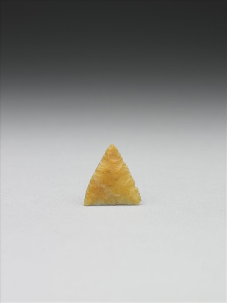 屬石英類礦物,石質,以壓剝法,製成不規則的三角形,為新石器時代華北居民製作的石鏃。