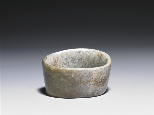 「斜口筒形器」是紅山文化晚期的典型玉器,為數甚豐,但隨著紅山文化的衰亡而消失。故長期以來學界對其造形源流及功能內涵,難以提出合宜的解釋。隨著1987、2007年安徽凌家灘遺址出土玉龜、玉龜狀扁圓形器、斜口筒形器,造形明顯有著先後傳承演變的脈絡,暗示紅山文化晚期斜口筒形器的出現,或可能是通過文化交流,受到凌家灘文化影響的產品。 此件矮形的斜口筒形器以淺青綠玉製作,大部分已沁作灰白色。較短一側內壁上有垂直鑽鑿的螺旋痕。