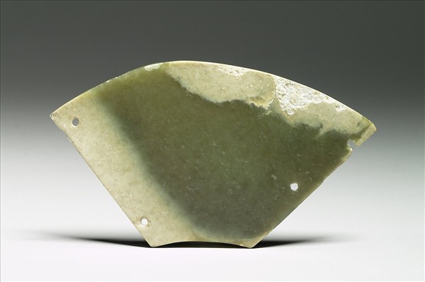 玉質,琢作一扇面璜形,或為多璜聯璧中之一片,二側邊各鑿一單面鑽成的圓穿,一穿已連至器緣。