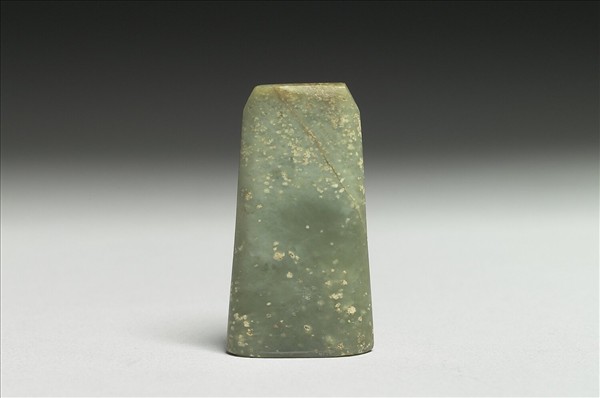 玉質,器形略作不規則的梯形,似為由某件玉器上所切下的片料,一面有一垂直鑽鑿痕。