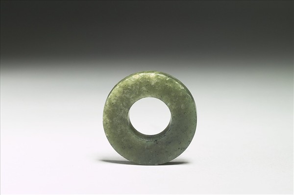 玉質,為製作玉璧時,取下的芯料。外周較為平直,正中央有圓孔。
