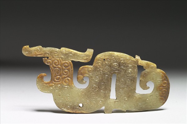 玉質,局部褐斑。雕一對龍形珮(購玉798-799),器表琢雲穀紋,龍頭部份似曾經改製,龍體上有二穿,龍體所出之彎勾處,尚雕有鳳首。