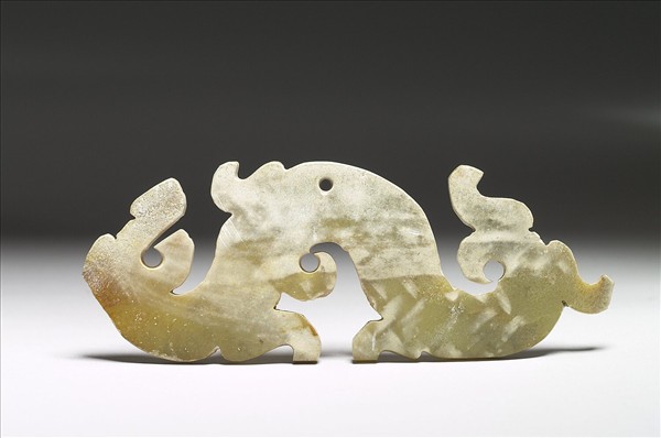 本件與購玉800成對,玉質,因埋藏受沁而呈黃褐色,並各有不同程度的白化現象。由於尚未修整完工,可以在嘴部、身軀以及尾部觀察到相同的勾轉單元,皆是以打孔、拉切的工序製作完成,相關工序在購玉355、803也可見到,可知這是當時標準化的製作流程。