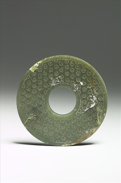 玉質,小局部褐斑。雕一穀紋璧,內外圓周邊緣,保留金屬管鑽的旋截痕。外緣有多出大小傷缺。