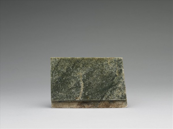 碧玉,表面多沁為灰色。為不甚規則的長方厚片,一面拋光,另一面未拋光。一側尚有直條切割痕。