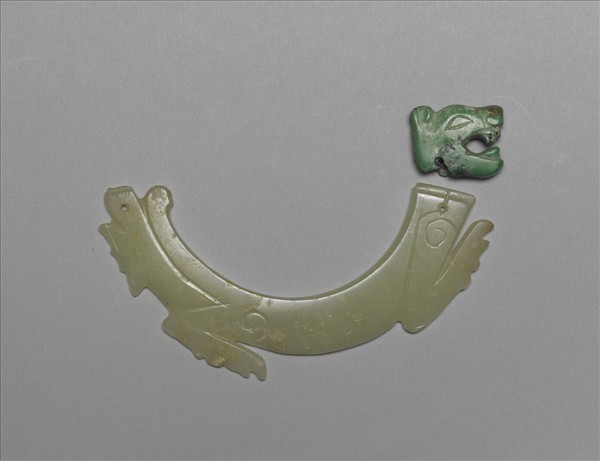 這是一件奇器,似由一件淺黃綠玉璧對切為二,成為二個圓弧形玉片,每片兩端各鑽一圓孔。再改雕成虎的身軀,有前、後肢。後肢後面一截在器緣雕琢華東式扉牙。另有綠松石雕琢的虎頭:短耳、圓鼻頭,陰線刻畫棗核形眼睛,張口露齒。是典型的後石家河文化虎頭造形。