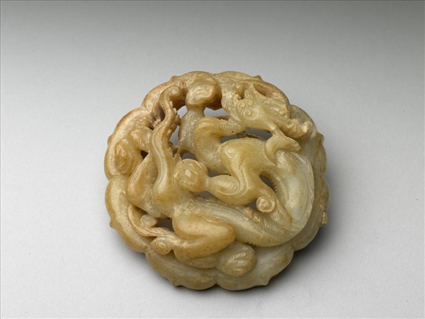 玉質,因受沁再經盤磨而呈現淺黃褐色斑。琢作一八瓣花式帶飾,橫向與縱向各有可供穿繫絲帶的窄槽。正面雕一張牙舞爪的盤龍。雖非精工之作,但充分表現元代較粗放的玉雕風格。