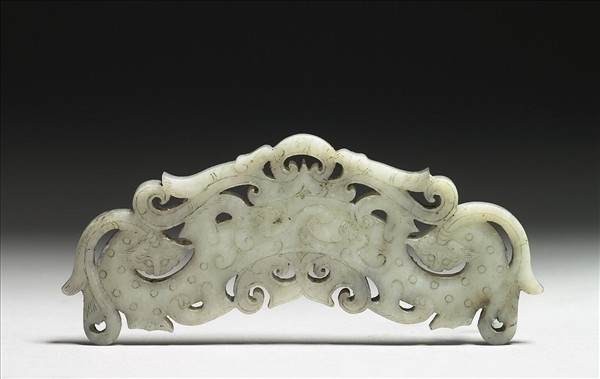 玉質,局部受沁白化。雖然不是東漢常見的多色玉質,但構圖、鏤空等創作原則和技巧,皆和購玉532相同,中軸上方作為繫帶穿孔的造形單元也類似,可知是同時代的作品。此外,規整布列在獸身上的圓圈紋,同樣是此時期典型的紋飾單元,如同故玉4358。
