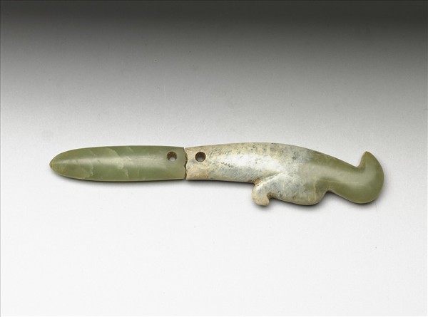 玉質,雕琢成玉鷹杖的上、下二截,中段可能接以木桿。上截雕有勾喙飄羽的鷹頭,下截琢成圓椎,以利插於祭壇或沙土中。鷹杖,是招降鷹鳥神靈的法器。