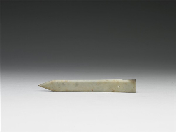 玉質,琢一戈,「援」部與「內」部形成直條片狀,無中脊。一面黏附泥土。援上鑽一圓穿。張家坡及辛村等西周遺址中,出土甚多此類玉戈。