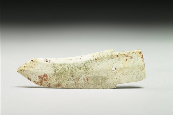 玉質,白化甚深,帶有少量硃砂。琢一小戈,略彎,有不甚明顯的中脊。約在援與內之間,有一小穿。張家坡西周遺址中,出土此類玉戈。