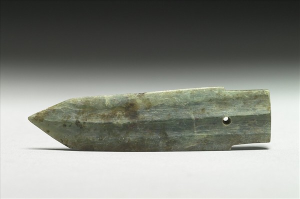雜然斑駁的青灰綠色玉石。琢一小戈,中脊與邊線明顯。約在援與內之間,有一小穿。平素無紋。