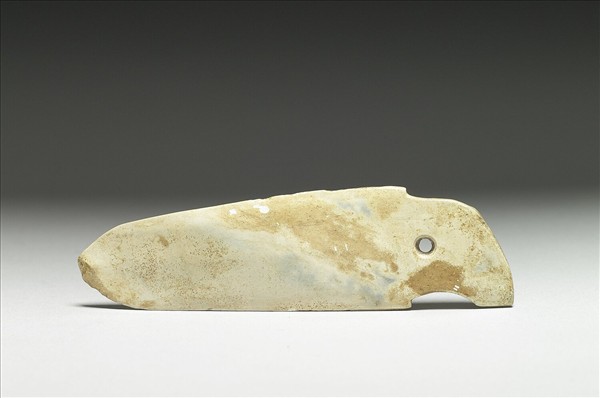 玉質已深沁為牙黃色,黏附少量硃砂。琢一小戈,有不明顯的中脊。內部向下彎曲,內之上近援部處,鑽一小穿。戈尖早已殘斷,並已磨禿,刃線上有少許傷缺。平素無紋。