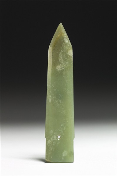 玉質,尚稱瑩秀。琢一小戈,邊線明顯,無中脊。援與內之間,鑽一小穿。張家坡、辛村及上村嶺等西周遺址中,出土甚多此類玉戈。