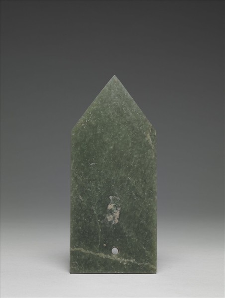 碧玉,質甚光潔。琢作一素圭,局部黏附有編織物花紋的泥土,並沾少量銅綠。素圭主要用於祭祀,或在墓葬中代表主人的身份。