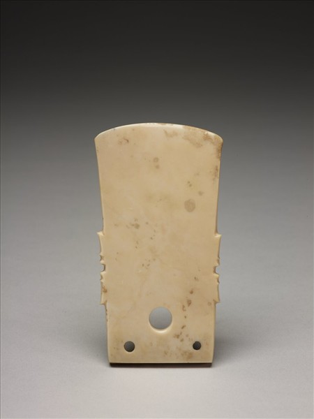 細膩有磁光的玉質,色澤質感與山東昌樂袁家出土玉圭相似。基本造形為玉鉞,在上、下側邊雕琢發展成熟的華東式扉牙。中軸線上單面鑽鑿一圓孔,孔壁尚直。左右二角各有一單面鑽之較小的圓孔,鑽鑿方向與大孔相反。刃部微有使用痕。 「鉞」是從工具中的「斧」發展的兵器,當鉞的兩側雕琢象徵溝通神祖的扉牙,可能即是《禮記‧明堂位》所記載的「玉戚」。是古代祭典中武舞時所拿的玉質兵器。