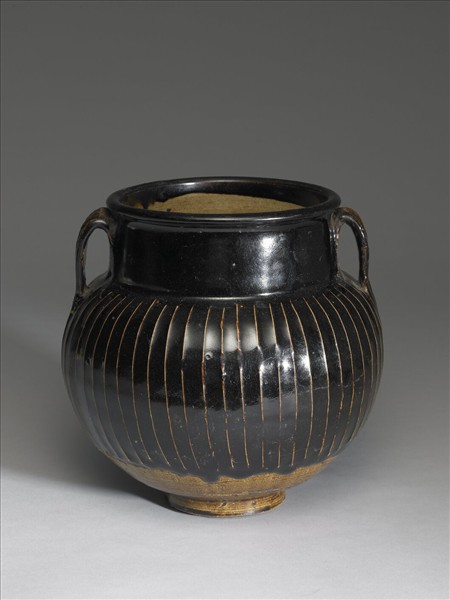 廣口罐,口緣出圓唇;直頸、圓肩腹、圈足,足形削刻不平整。肩頸間附雙板狀耳。耳與器身均以直稜泥線為飾,再上黑釉,釉色凝厚鮮亮,但施不到底。器胎灰白,雜質多,塗佈有褐色汁。器裡僅口緣有釉。
