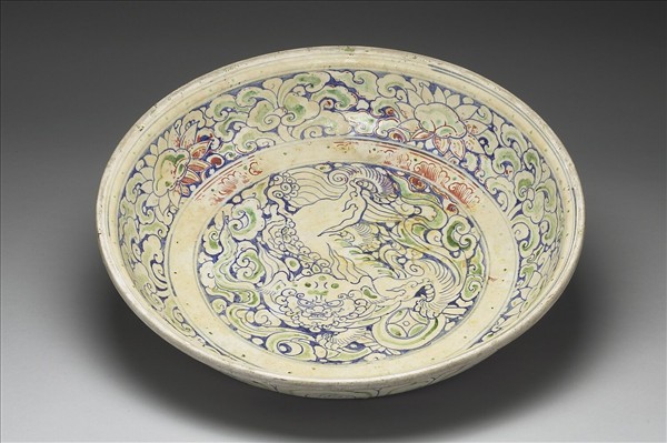 侈口外撇,弧形壁,圈足。全器以釉下青花及釉上紅綠彩彩繪獅子戲球,內壁作藍地白蓮花間靈芝雲紋,外壁則飾變形蓮瓣紋二重。雖然彩大多脫落,紅彩不全,但青花筆繪甚佳,紅彩殘存之花卉仍明顯,在同類作品中仍屬相當好的作品。器底露胎,刷鐵汁一層,並有泥貝膠結殘存。本批瓷器應是來自越南海陽省(Hai Duong,紅河流域下游)的Chu Dau窯址,風格上與 1990年代打撈的會安沉船(Hoi An Shipwreck,約為十五世紀末至十六世紀)出土器物相似。