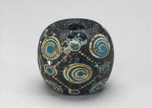 藍黑色橢圓球形珠,外壁飾大小兩種同心圓眼珠形紋飾,均以綠白相間環圈組成。大型眼珠紋白綠相間,小型眼珠紋以白色點狀串珠紋相連,呈菱格形。胎體與綠色紋飾剝蝕處呈現透光塊面。湖南懷化黔陽、辰溪米家灘戰國墓葬、廣州西漢南越王墓曾出土類似琉璃珠。