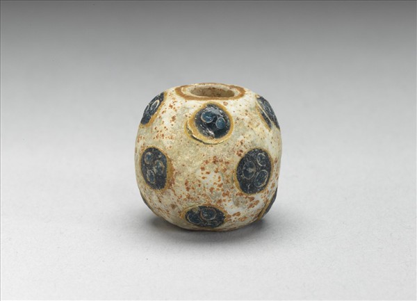 白色琉璃珠,隱微透光,黑地圓渦紋四向排列,每一圓渦紋中各有三個藍色眼狀紋飾。