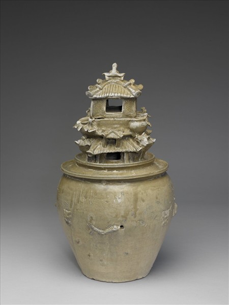 這件堆塑罐的胎質堅硬緊緻,釉色青中帶黃。同類型罐常被稱為堆塑罐或穀倉罐,器身可以分成上、下兩部分來看,下半部為罐型,豐肩、腹下漸收,腹部貼飾各種水生動物;上半部堆塑亭臺、樓閣及飛禽。 堆塑罐是三國吳末年及西晉時期南方地區的隨葬明器,如浙江紹興吳永安三年(260)紀年墓和同地西晉墓葬都出有類似作品。造型承襲自東漢時期的五聯罐,而中央主罐的比例加大,於主罐口沿附以四小罐,再於其上堆塑貼飾。在中國陶瓷史上,六朝青瓷的製作,不論是在造型、裝飾或燒造技術方面,都達到前所未有的高峰;穀倉罐、雞首壺、蓮瓣盤,則分別為三國吳末至西晉、東晉以及南朝青瓷作品的代表。