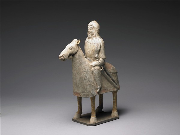 武士騎馬的塑像,武士左戴佩劍與劍套,馬身披鐵甲。其做法乃以灰陶雕塑,再敷粉上彩。造型寫實而簡要。