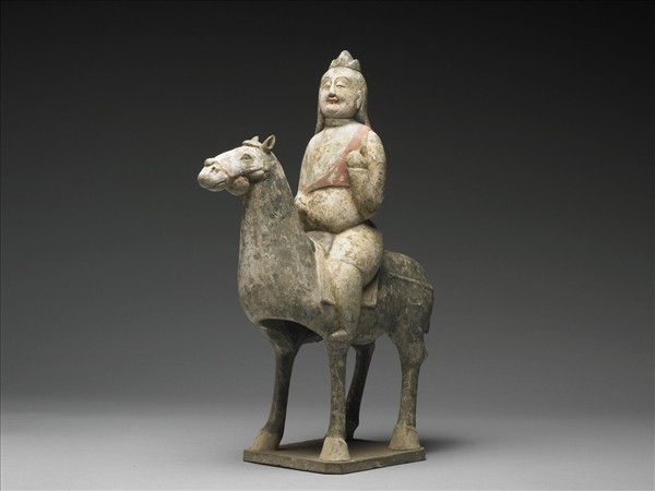 一人騎馬的塑像,騎士頭戴帽,身穿紅衣。其做法乃以灰陶雕塑,再敷粉上彩。造型寫實而簡要。